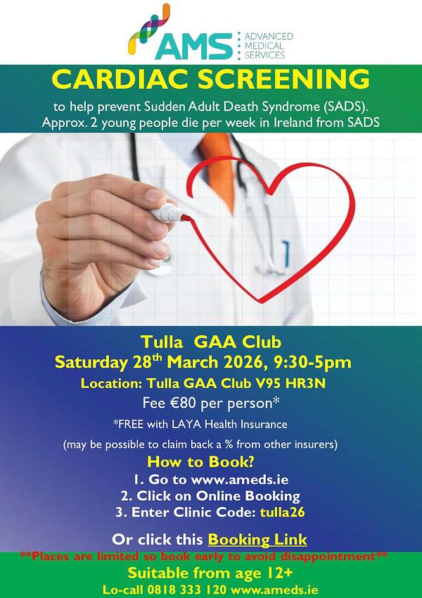 Following a strong level of interest locally, AMS will host a Cardiac Screening Day in the Pavilion at the pitch on March 28th 2026.